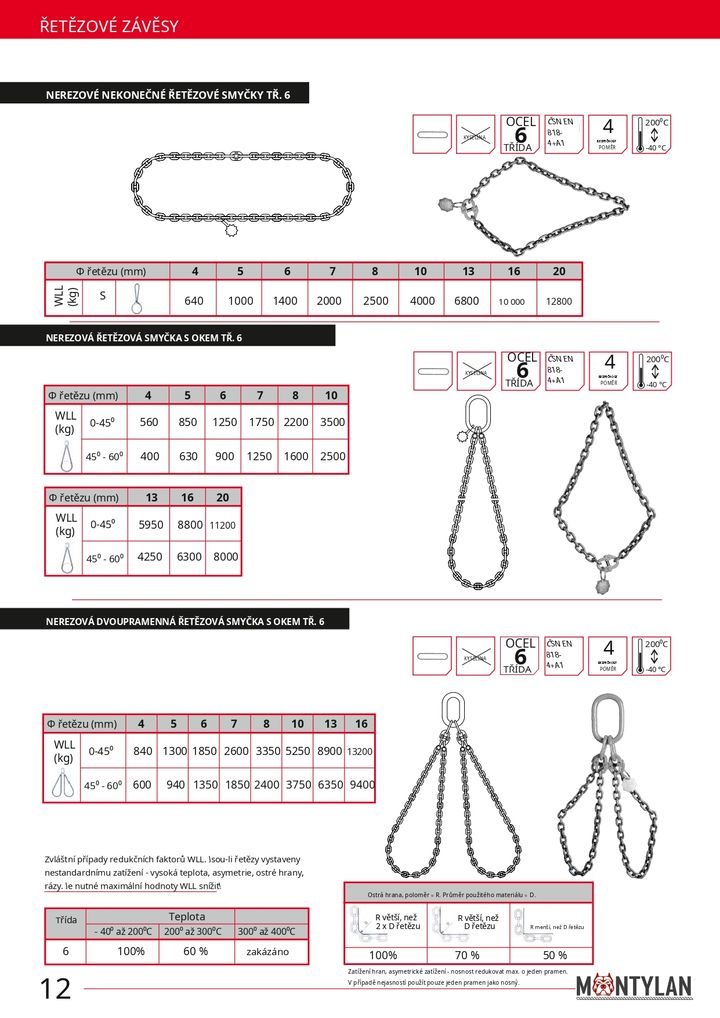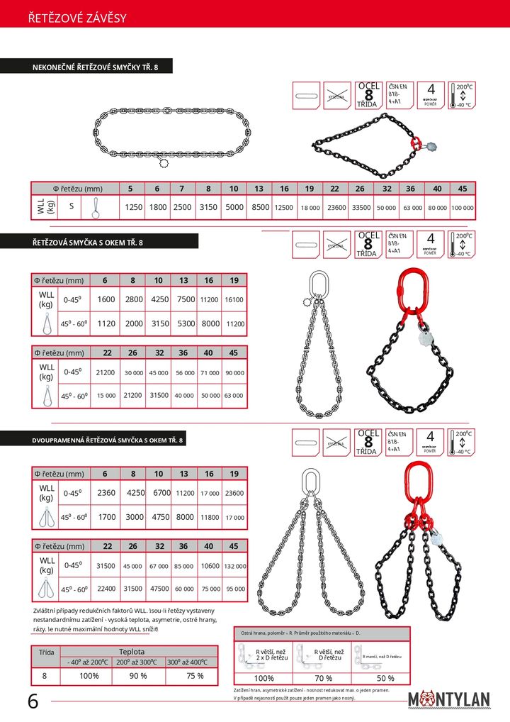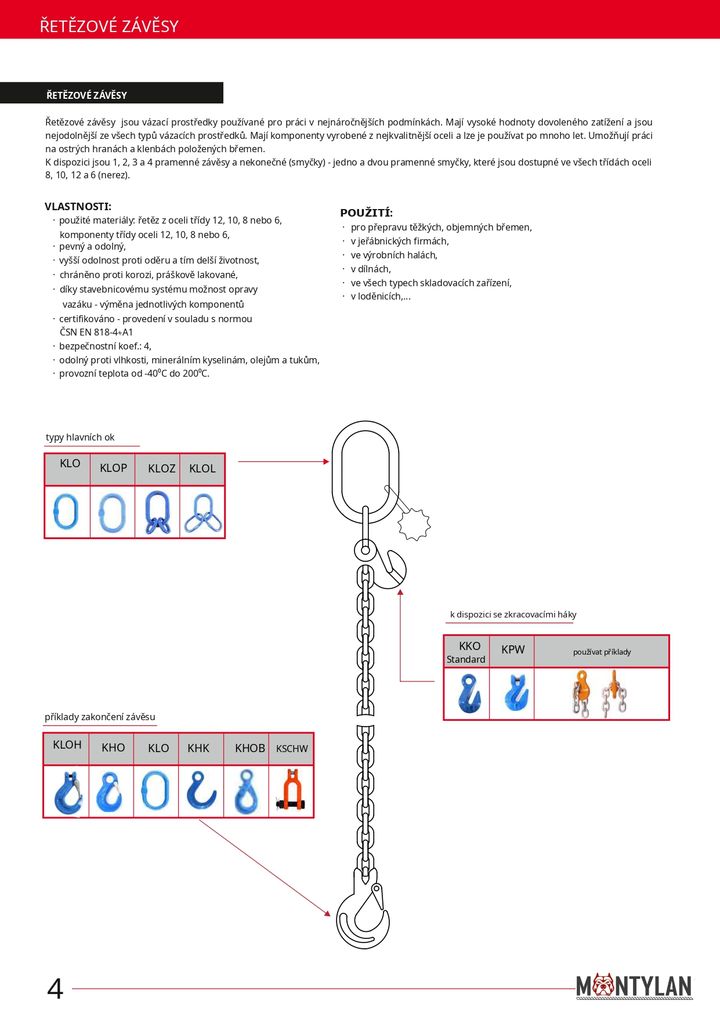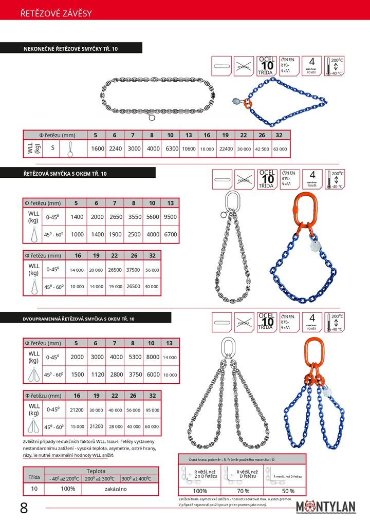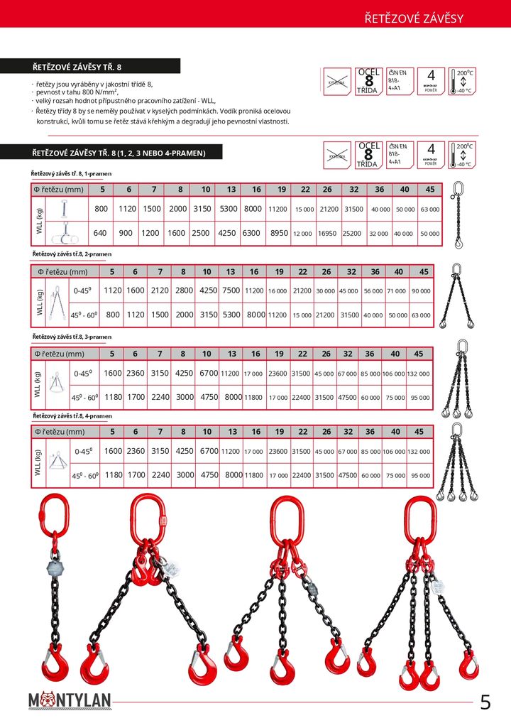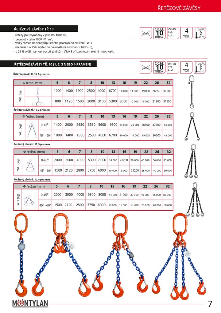 Řetězové závěsy jsou vázací prostředky používané pro práci v nejnáročnějších podmínkách. Mají vysoké hodnoty dovoleného zatížení a jsou nejodolnější ze všech typů vázacích prostředků. Mají komponenty vyrobené z nejkvalitnější oceli a lze je používat po mnoho let. Umožňují práci na ostrých hranách a klenbách položených břemen. K dispozici jsou 1, 2, 3 a 4 pramenné závěsy a nekonečné (smyčky) - jedno a dvou pramenné smyčky, které jsou dostupné ve všech třídách oceli 8, 10, 12 a 6 (nerez).
